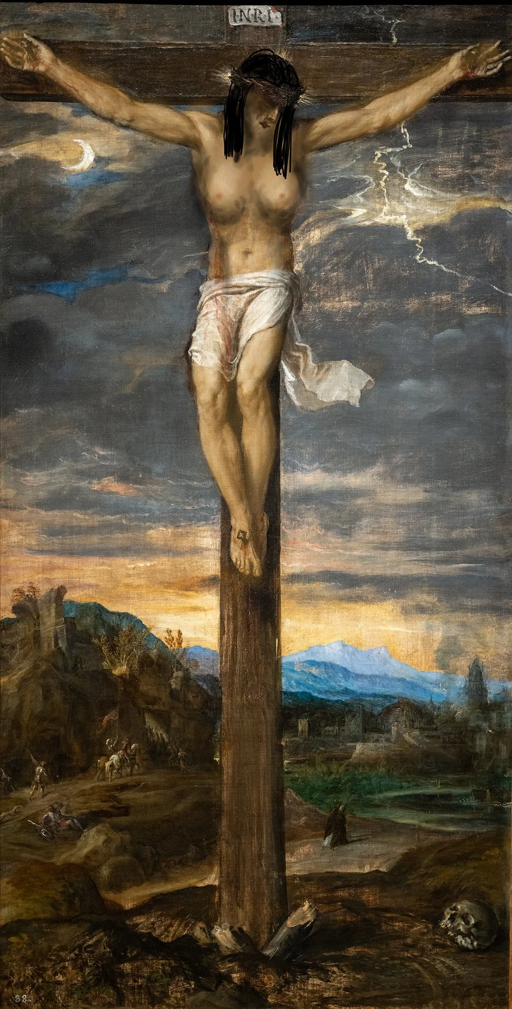 From a white male saviour, dying for our sins, to a brown woman in his place (after Titians Christ Crucified).