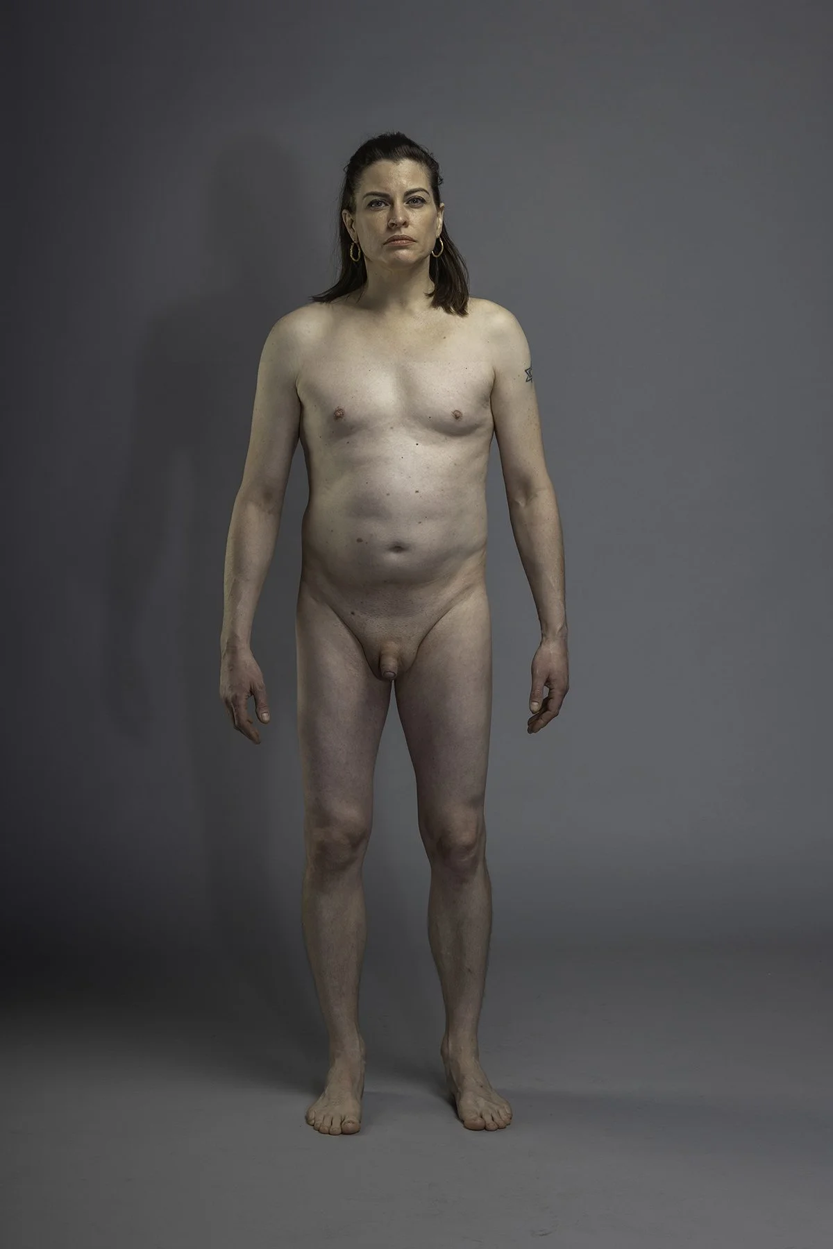 Regardless of the production method I eventually employ, I start with my goal in mind, that of the mental images that my non-practice research generated. In this instance, the first image that came to me, loosely formed was that of a gender-blended body, male with female elements standing naked in a “female” public toilet of sorts. I imagined the drab or block colours of an institutional space and harsh unflattering lighting illuminating repeated design and utility elements such as cubicles and sinks. My composite, ambiguous body is standing facing the camera with the gendered environment as a backdrop. I imagine the expression as frank without being overly confrontational, the figure stands straight, arms hanging by their side. It is the topographical approach to photographing the body that I have used on occasions before, a non-sexualised body that seems to invite scrutiny and understanding. This then is how I resolved to photograph the bodies (my partners and my own) in the studio for these tests.