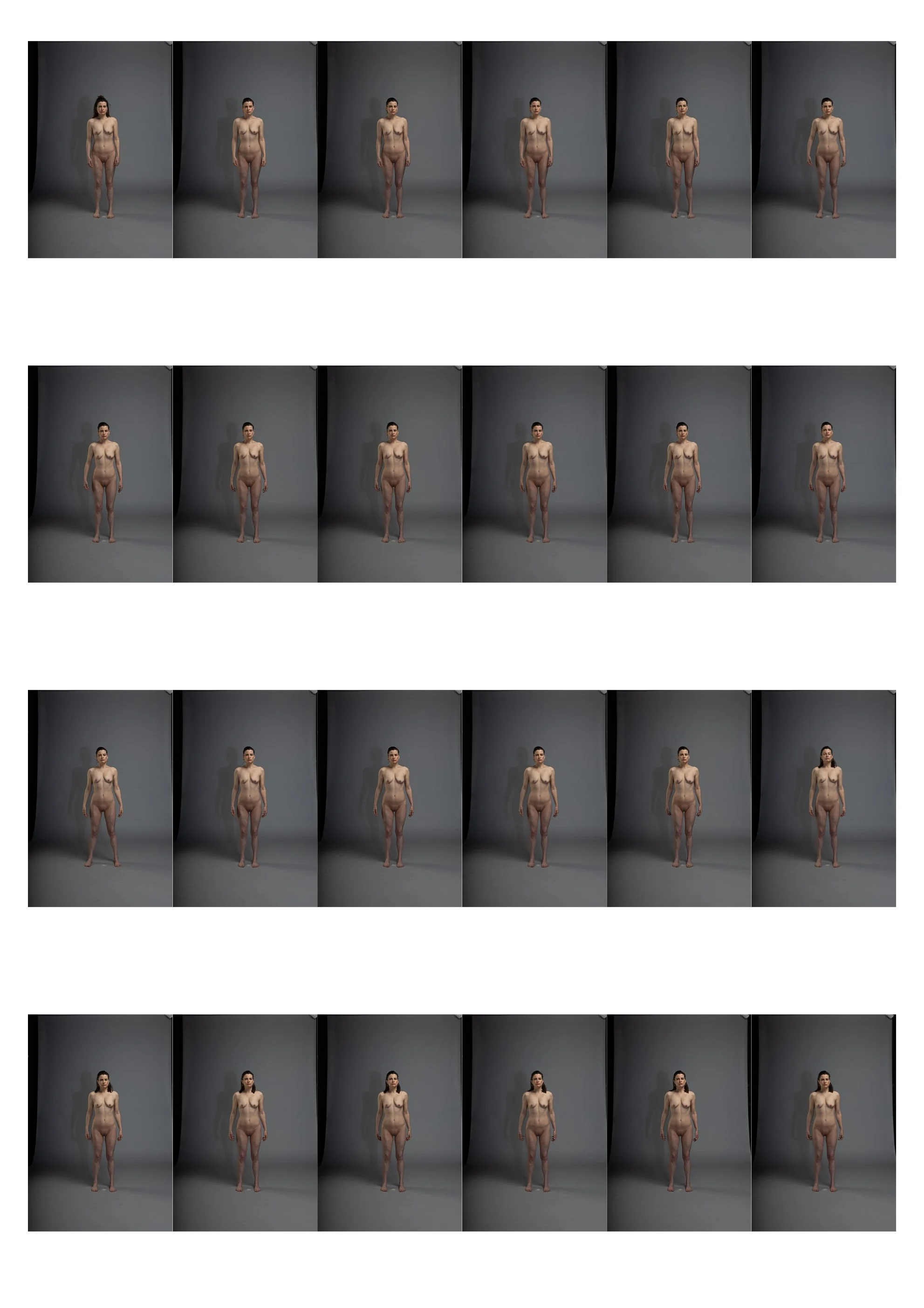 Once I had several images of myself where I was happy with both the expression and pose, I was able to move on to photographing the female body of my partner. What instantly became apparent was the difference between the default stance that each of us took when standing to be photographed, I would stand with my feet shoulder width apart whereas my partner would stand with her feet much closer together. Just in case this might prove problematic in the composite beings I wanted to create, I got some shots of my partner in a stance matching mine and covered off some more shots of myself with my feet closer together like hers. This provides me with options at the compositing stage. Confident that I now had enough images of our male and female bodies to make some successful composite beings I wrapped up the studio shoot knowing I would need to return to the toilets at my place of work with camera and tripod to take some shots into which I could add the composite beings I would produce.